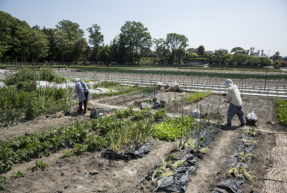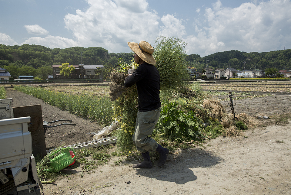 しばらく手を休めて話に付き合ってくれた修一さんは、花が咲いてしまったのらぼうを引き抜いたり、収穫が終わった畝のマルチ(農業用ビニールシート)を外したり、次の作物を植え付けるための下準備を再び始めた。この日、全国的に強い日差しが照りつける夏日がニュースになっていた。