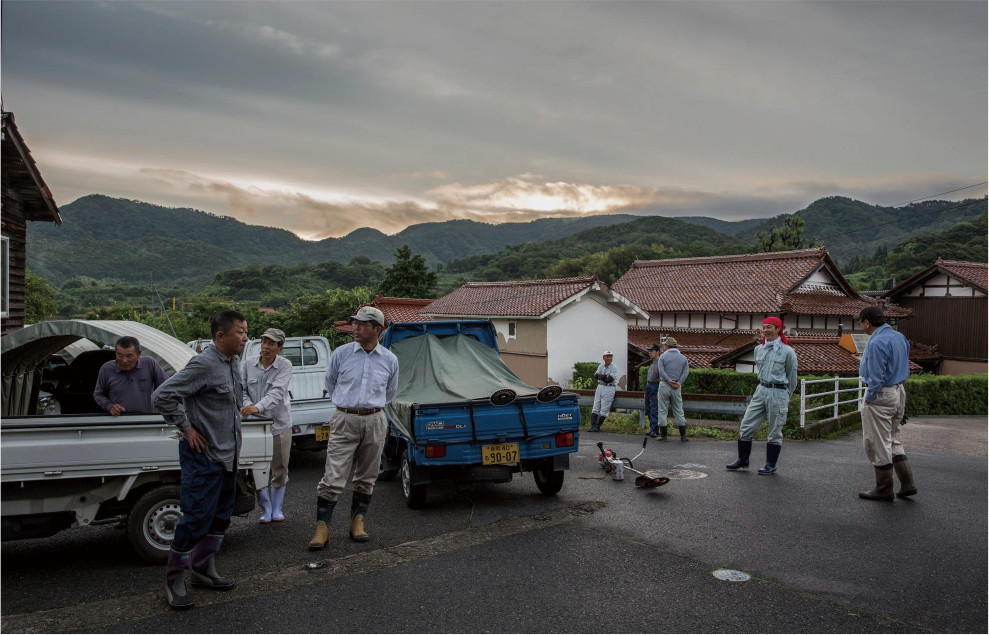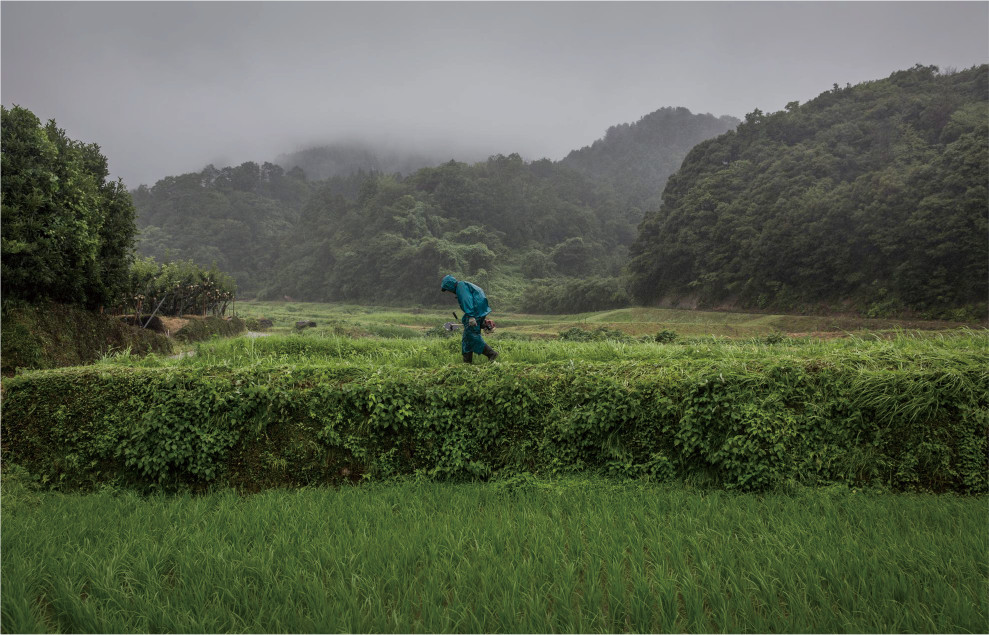 朝から小雨が降り続いていた。集落の山側にある棚田へ続く道路を横切ろうとする勇敢なカタツムリが、精一杯体を伸ばして雨の中を悠然と這っている。カタツムリを避けるように軽トラックが坂道を上って行った。荷台には草刈り機が一台。坂道を上ると、雨合羽姿の男性が、道路脇で草刈り機に燃料を入れている。