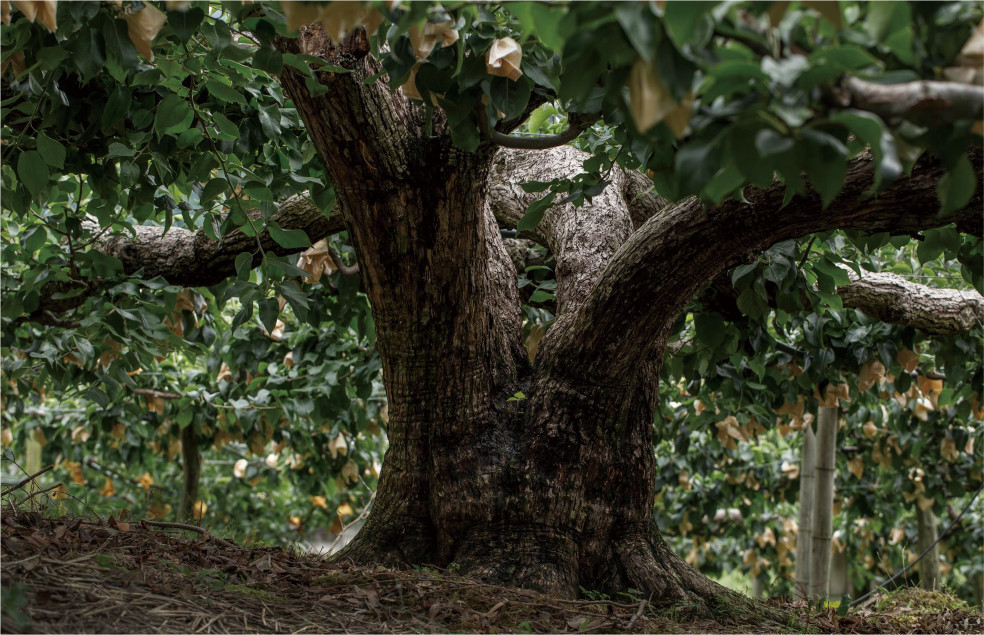 西田陽二さんの梨畑にある樹齢100年を超える二十世紀梨の木は、1本で2700個の実を付ける