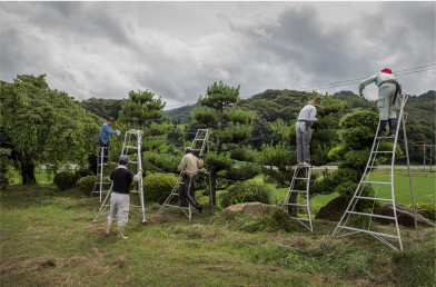 各人が思い思いの木に脚立を立てて剪定する
