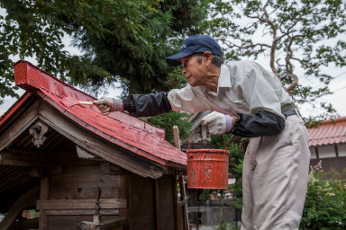 火の神さまだ、いや火事の神さまだと、ペンキを塗りながらお互い譲らない。そのうち、正面を塗り終えた征一さんが「そっちの裏は、タケちゃんがしよんだけんの、わしゃ知らんぞ」と、先に脚立を降りた。タケちゃんとは健弘さんのことだ。「何かお陰があるか思うて塗りよんじゃけど、お寺を守るちゅうのもえらいの」と、言いながら丁寧な仕事ぶりだ。タケちゃんは、秋葉山の屋根を塗り終えると、率先して中ノ倉庫の屋根に掛かっている梯子に登り始めた。