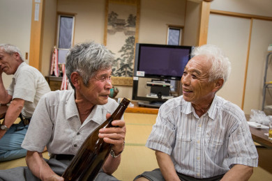 総事は無事に終了し、慰労会が始まった。タケちゃんは、ここでも主役。「ここでは、一升瓶ごと燗をしますけん」と、一升瓶を右手に、湯飲みを左手に酩酊気味だ。河原秀雄(かわはら ひでお)さん(78)と二人で差しつ差されつだ。「朝もとう(早く)から、なかなか総事はえらいだけど、今日は俺も本気だった」とタケちゃんが言えば、「宮崎から取材に来とるからな」と、合いの手を入れる秀雄さん。「ちいとこばえに(少し早めに)いぬる(帰る)わい。記者さん、ようたんぼこいて(酔っ払って)カメラをめがん(壊さぬ)ように」と、タケちゃんは私に気遣いながら帰って行った。
