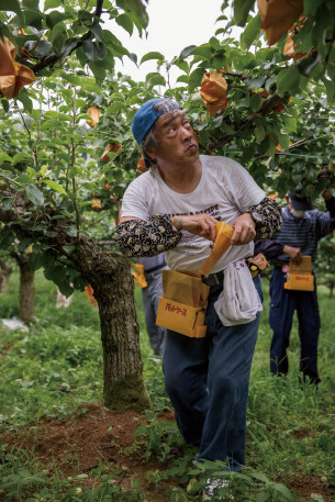 「袋の数にして10万枚くらい掛けるでしょうかね。今日の作業は、新興という赤梨の品種。赤梨が甘いのでね。今は甘いものが好まれますからね。二十世紀梨は曲がり角にきていますね」