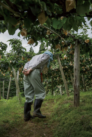 「雨降りでも袋掛けてな、大変でも共同のが優先だからな」と、小雨が降ったり止んだりする中で、腰を屈めたり後ろに反ったりしながら、体の前に提げた箱から素早く一枚ずつ袋を抜き取り、ピンポン球ほどの大きさになった梨の実に次々と袋を被せていく。針金で蔕(へた)に袋を留めた後、袋の下をプッと押し潰して風の抵抗を少なくする。どこの梨畑にも防風ネットが張り巡らされているのは、それほど風の影響が大きいのだろう。