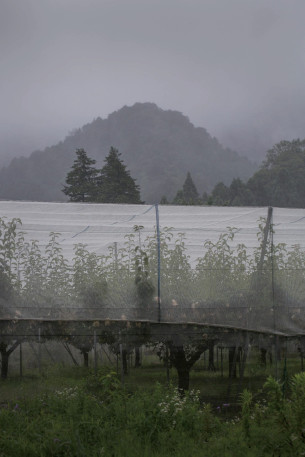 小雨に煙る梨畑。梨の木は暴風ネットで