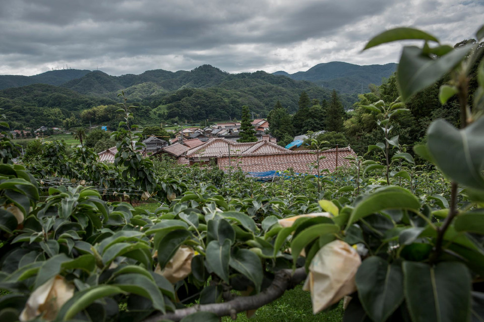 梨畑の中から赤瓦が美しい別所の集落を望む