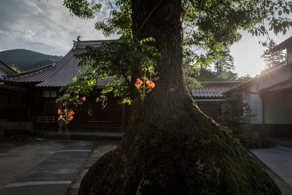 長栄寺の境内でノウゼンカズラが夕陽に照らされる
