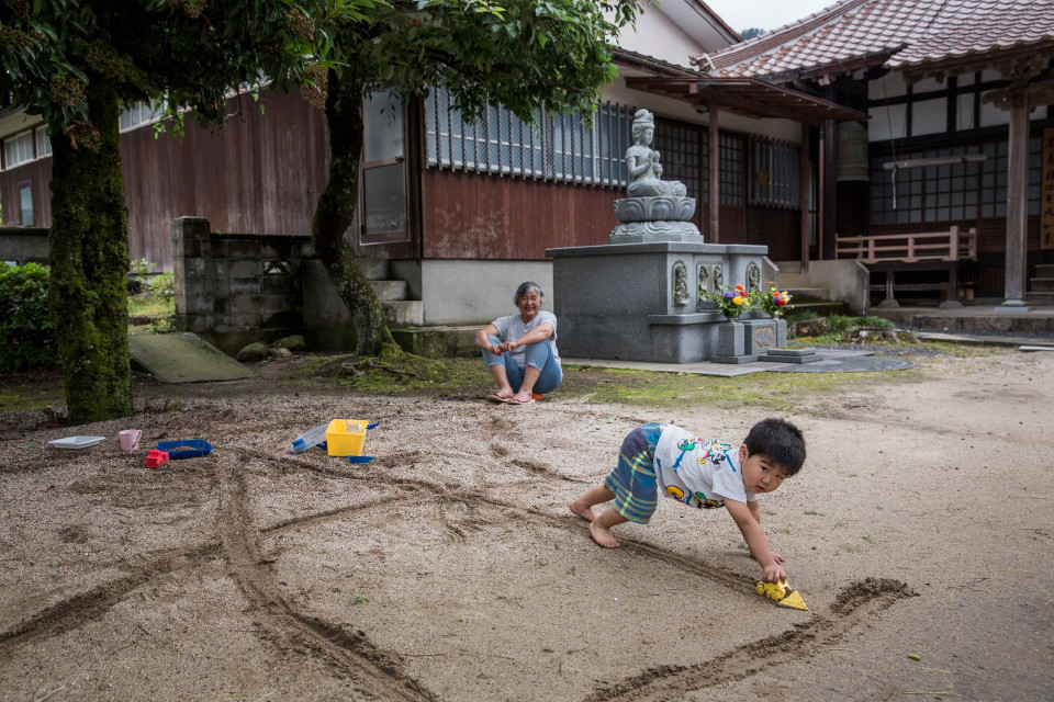 長栄寺の境内で孫の守をする
