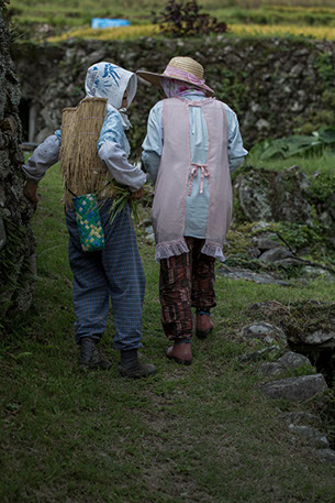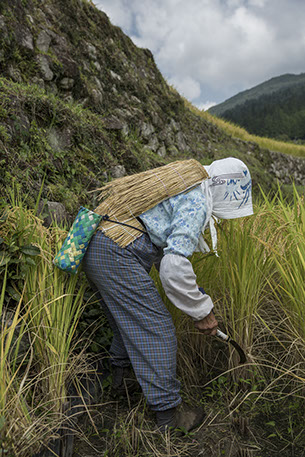 石積み近くで稲を刈るセガミノを着けた五百子さん