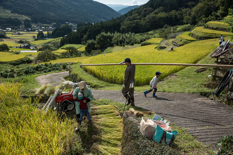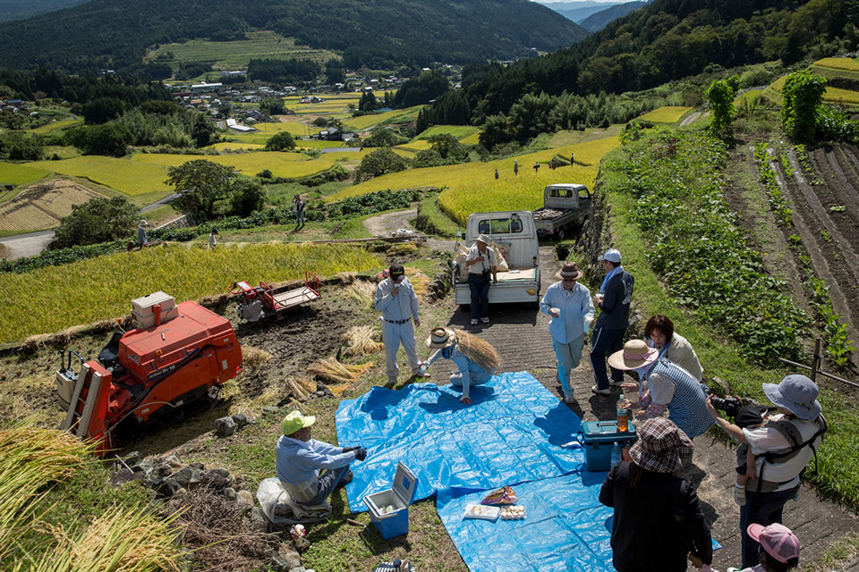 上の田んぼを半分ほど刈り残したまま、文夫さん宅の稲刈りは、昼までで終わった。「乾燥機が小さいもんで、よけ入らんもん」と、文夫さん。この後、五百子さんが準備した昼ご飯をみんなで食べて、ひと休みしたら夜はバーベキューなのだ。稲刈りの他には、田植えとキウイフルーツの取り入れの時に、こうして身近な家族や親戚、それに友だちが集まって一緒に仕事をするのだと言う。そんな折々の機会を積み重ね、自分と繋がっている人びとを確かめ合うことで、ふるさとの記憶が刻まれていく。
