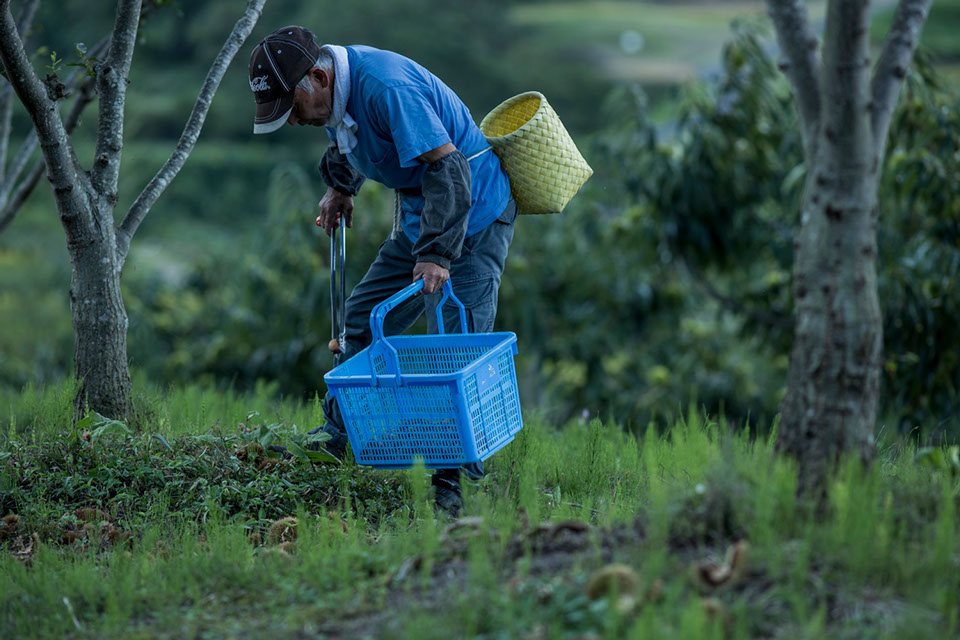 栗を拾う直さんの身のこなしは、とても77歳とは思えないほど機敏だ。右手に大きめの火バサミ、左手に四角いカゴを持ち、つま先だって歩くような身のこなしである。妻の幸子さんも、その機敏さを認める。