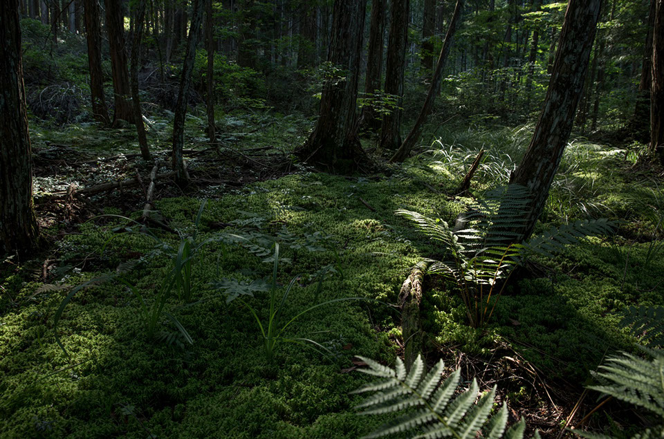 剛さんのハス畑の脇を通っている歴史の道、黒瀬街道を歩いて坂折川上流域へ向かう。見行山(904.9m)の鞍部(あんぶ)は「山名」と呼ばれ、南北に600メートル東西に100メートルほどの水苔に覆われた湿地帯がある。ここが坂折川の水源となっていて、坂折棚田約360枚の水田を潤している。湿地帯を覆う水苔の上を歩くとふわふわで、厚さ5センチの絨毯を踏んでいるようだ。ここ「山名」の湿地帯から一本の細い水路ができ、その流れが坂折川を形作り、中野方川に流れ込んだ後に木曽川へ合流している。坂折棚田は、400年ほど前から築き始め明治時代初期には現在の形に出来上がっていた石積みの棚田だ。坂折棚田の灌漑用水は坂折川から取水する他に、山側の石垣から滲み出す湧水も重要な役割を果たしている。この湧水は水温が低いため、水田に直接入らないように石垣と水田の間に「手あぜ」と呼ばれる細い水路を作り、この「手あぜ」を通るうちに水温が上がるような工夫が施されている。先人の知恵が今に活きているのだ。