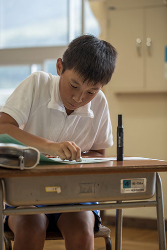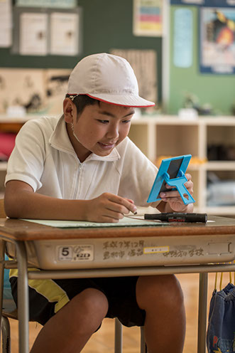 鏡を見て自分の似顔絵を描く鈴村仁くん