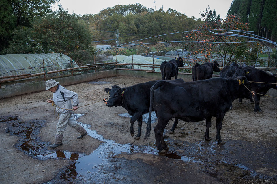夕暮れが近くなって智大さんの家を訪ねると、祖父の穴井正秋さん(76)が、外の運動場に出していた牛を牛舎に連れ込んでいる。親牛7頭、育成牛が3頭、それに、まだ名前の付いていない子牛が3頭居る。
