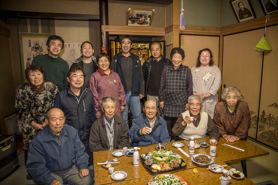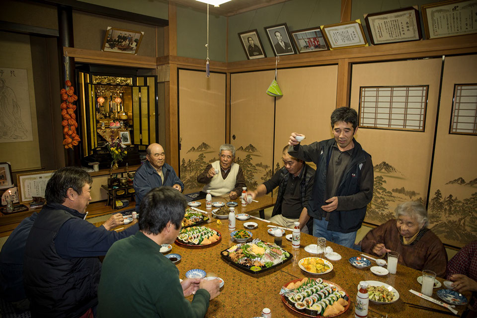 信次さんことシンちゃんの姿が見えないが、他は全員揃った。「シンちゃん、どうしたん」「いま電話したら、忘れとったちゅうぞ。今から行く言いよるけん」「ほんなら始めとこか」。全員が座敷に移動する。神棚と仏壇前の大きな座卓に、ひとり分ずつの皿と箸がきちんと揃えて準備されてあった。上座に座るのは、年の順と決まっている。シンちゃん、タケちゃん、テツちゃんの席だ。
